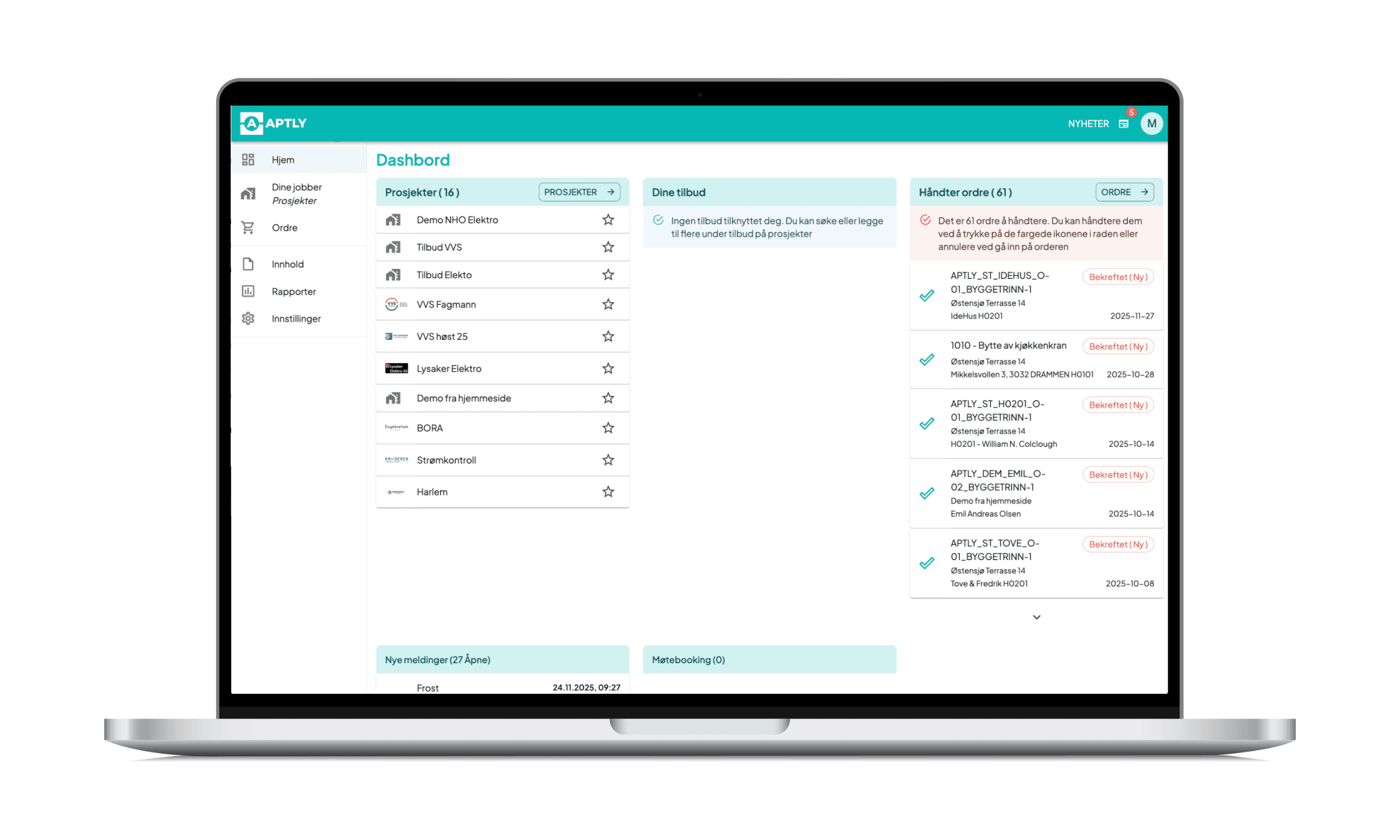 Aptly samler alt på ett sted: kundedialog, tilvalg, dokumenter, bilder, romskjema, signering og mer. Det gir deg bedre oversikt, færre feil og mindre manuelt arbeid. Med automatiske påminnelser, ryddig arkiv og full sporbarhet blir både hverdagen og kundereisen mye enklere. Vi har grossisttilknytning med over 600k produkter, og prissammenligningsløsning for økt inntjeneing/margin og bedre innkjøp.